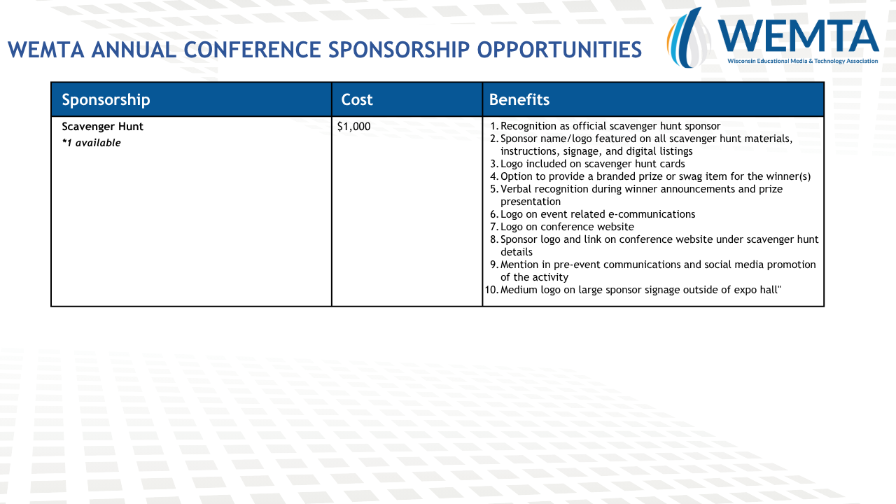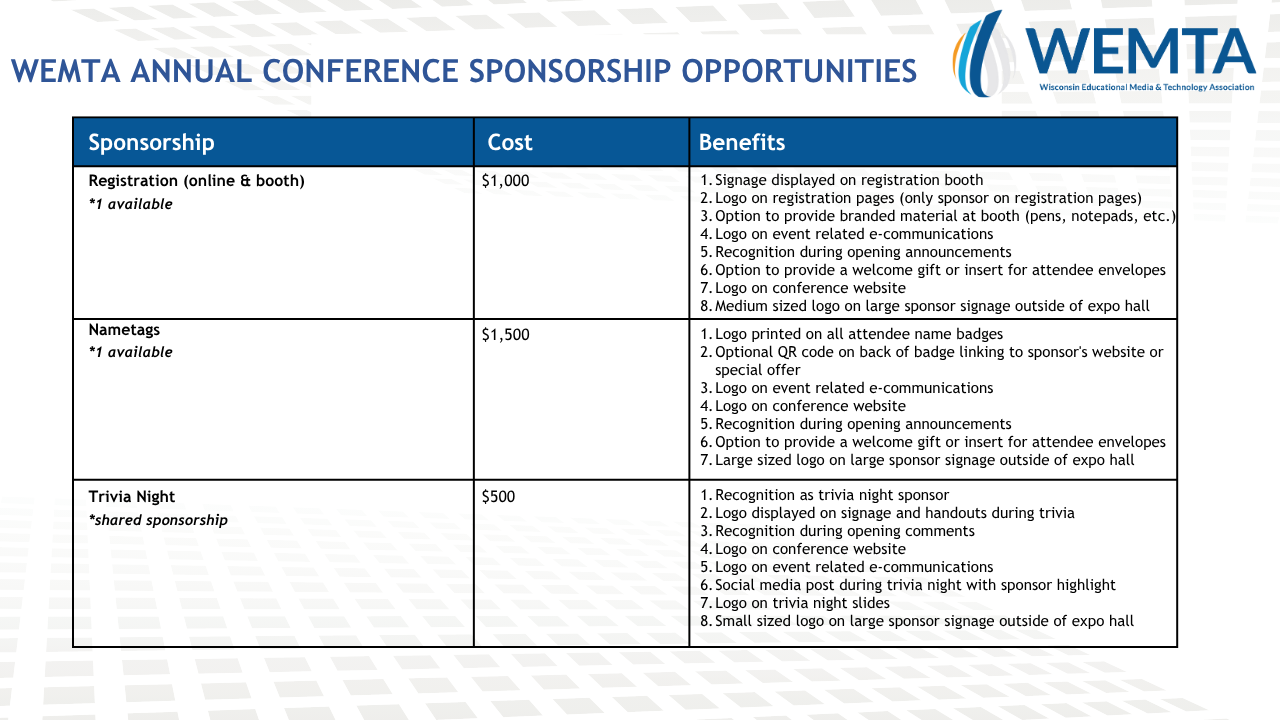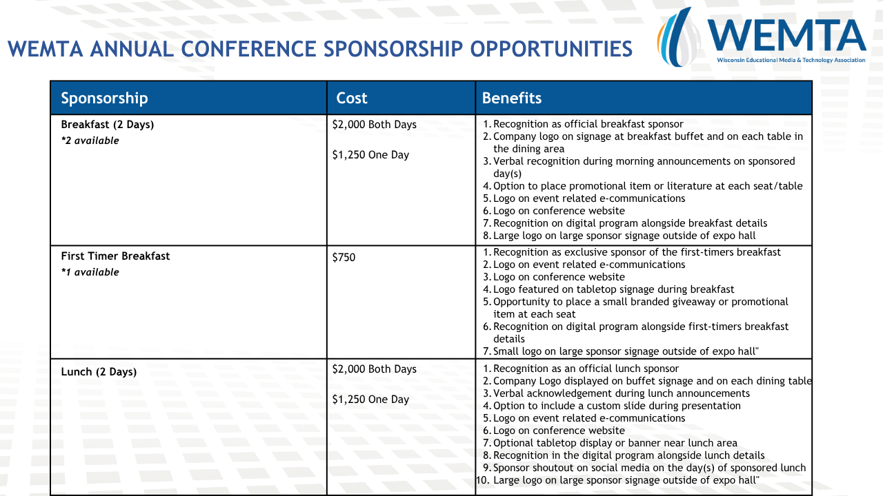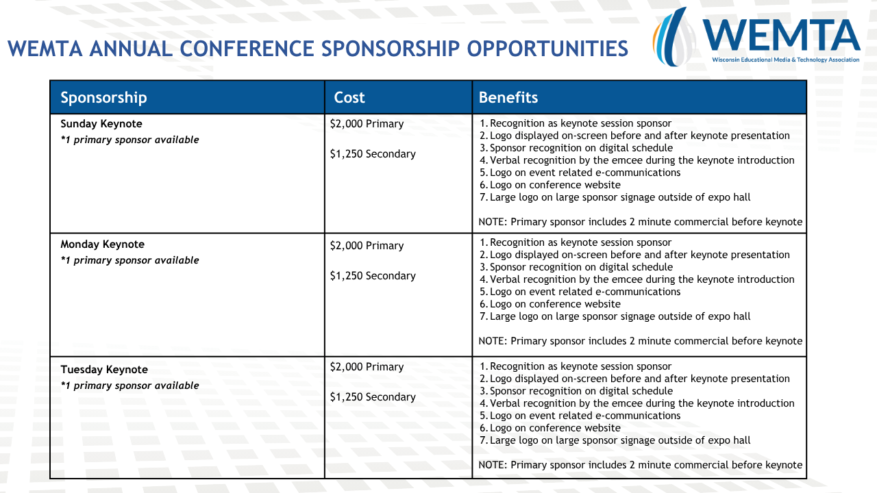Opportunities are limited and will be reserved on a first-come, first-served basis. Review the full list of benefits in the graphics below and register today to align your brand with WEMTA’s mission of advancing educational media and technology in Wisconsin schools.